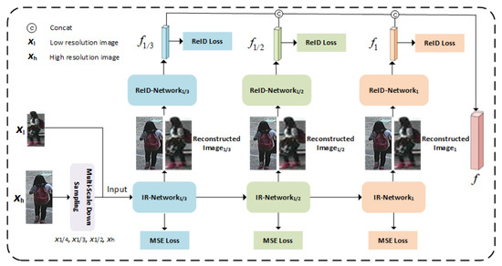 Assuming that is an HR image set, where denotes a HR image and l is corresponding identity label. In order to train the IR networks, we down sample each in the image set to three variants with different resolution scales using down-sampling rate randomly picked from , and we denote the resolution scales as , and , respectively. Then the down-sampled images are resized back to their original size via bilinear up-sampling and denoted as , , . The identity label information remains unchanged in the process of down-sampling and resizing. The down-sampled images are only used in the training phase of the proposed framework. IR networks are trained using images with different resolutions generated by HR image subsampling. In this way, each IR network focuses on image reconstruction with specific resolutions and can adapt images with different resolutions as input.