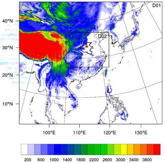 This study used the advanced research version of the weather research and forecasting (WRF-ARW) model, version 3.9. The experiment used a nested grid setup for two domains, with a grid spacing of 9 km for the outer domain (D01) and 3 km for the inner domain (D02) (Figure 1), which is a common model configuration used in operational forecasting. The vertical grid contained 51 levels, of which levels 1–14 were below 700 hPa and affected by terrain height, and the pressure at the top of the model was 50 hPa. The physical parameterizations were as follows: the new Thompson microphysics scheme [], the rapid radiative transfer model for GCMs (RRTMG) longwave and shortwave radiance schemes [,,], the Yonsei University planetary boundary layer scheme [], the Noah land surface model [], and the new Tiedtke cumulus scheme [] for D01.