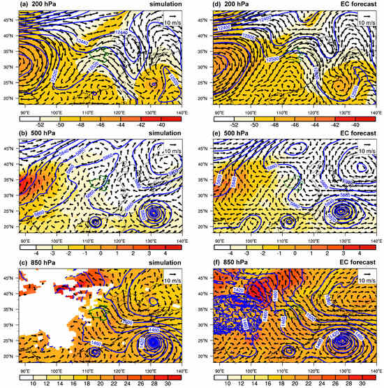 Temporal average (from 1200 UTC on 19 July to 1200 UTC on 20 July) of geopotential height (contours; gpm), wind (vectors; m·s−1), and temperature (shading; °C) at (a) 200 hPa, (b) 500 hPa, and (c) 850 hPa, derived from WRF simulation. (d–f) are the same as (a–c), but derived from ECMWF forecasts. The green lines represent the boundary of Henan Province.