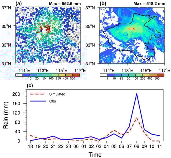 The spatial distribution of (a) observed and (b) WRF-simulated 24 h cumulative rainfall (mm) from 12 UTC on 19 July to 12 UTC on 20 July. (c) The hourly rainfall (mm) from observation and WRF simulation from 1800 UTC on 19 July to 1100 UTC on 20 July 2021 at the Zhengzhou station and the simulated largest hourly rainfall grid. The black lines in (a,b) represent the boundary of Henan Province. The black stars in (a,b) represent the Zhengzhou station.