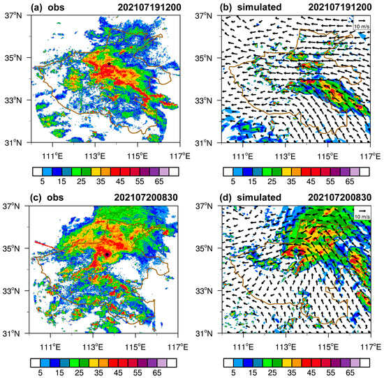Radar composite reflectivity (shading; dBZ) derived from (a,c) operational weather radars and (b,d) WRF simulations. Distribution of WRF-simulated wind field (vectors; units: m·s−1) in (b,d) at 850 hPa. The brown lines represent the boundary of Henan Province. The black stars represent the Zhengzhou station.
