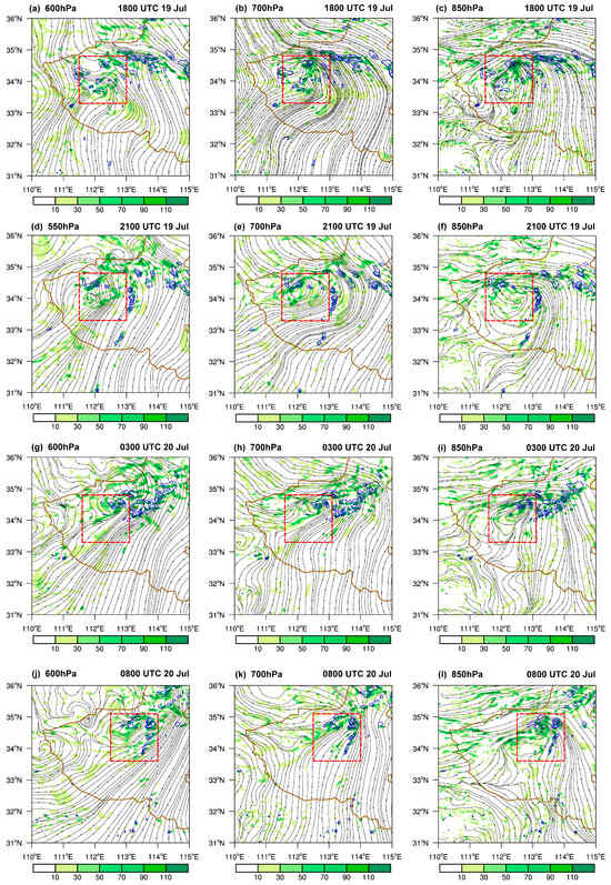 Based on the above evaluation, and despite the fact that the extreme hourly rainfall intensity remained weaker compared to the observations, the WRF simulation captured well the persistent rainfall during 19–20 July 2021, with an improvement in the location and intensity of rainfall compared to that of the ECMWF forecast (Figure A1). On the other hand, the simulation also reproduced the occurrence and development of the main MCSs affecting the “21·7” ERE in radar reflectivity. Therefore, the simulation results could be used to analyze the mesoscale vortex affecting the “21·7” ERE.