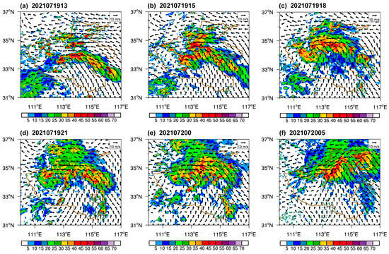 Is there a direct correlation between the HHV and heavy rainfall? Furthermore, Figure 7 shows the distribution of the simulated radar composite reflectivity and the wind vector at 850 hPa. Before the formation of the HHV (before 1800 UTC on 19 July), a southeast–northwest banded convective system appeared in Henan, with a peak radar reflectivity over 50 dBZ (Figure 4b and Figure 7a,b). Subsequently, the band-shaped echo gradually developed into a spiral echo in the northeast of the HHV, but at this time, the convective cells above 40 dBZ were still scattered. With the development of the HHV, the convective cells gradually merged and blocked at Zhengzhou, with the peak radar reflectivity exceeding 55 dBZ, resulting in persistent heavy rainfall. Therefore, the HHV was closely associated with the MCS that was blocked at Zhengzhou.