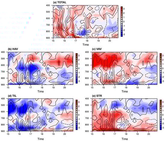 Key-region-averaged (a) left-hand-side term (i.e., the time derivative) (contour; 10−5 s−1 every 15 min) and the total of four relative vorticity budget terms (shading; 10−8 s−1). (b) HAV, (c) VAV, (d) TIL, and (e) STR terms (shading; 10−8 s−1) and a total of four relative vorticity budget terms (contour; 10−8 s−1) from 900 hPa to 400 hPa.