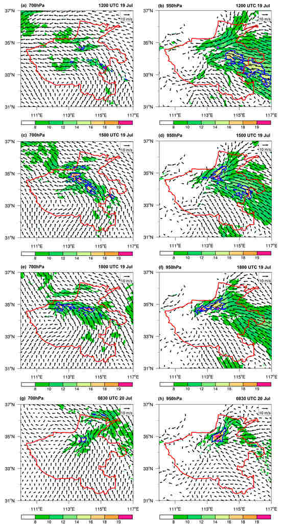 Distribution of WRF-simulated wind speed (shading, m·s−1) and wind field (vectors; units: m·s−1) at 700 hPa and 950 hPa. The blue contours indicate the great wind speed (above 14 m·s−1). The red line represents the boundary of Henan Province. The purple stars represent the location of the Zhengzhou station.