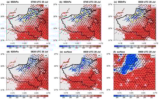 Distribution of (a–e) WRF-simulated and (f) observed temperature (shading, K) and wind field (vectors; units: m·s−1) at 925 hPa, 950 hPa, and surface. The grey shading represents the terrain above 500 m. The purple stars represent the location of the Zhengzhou station.