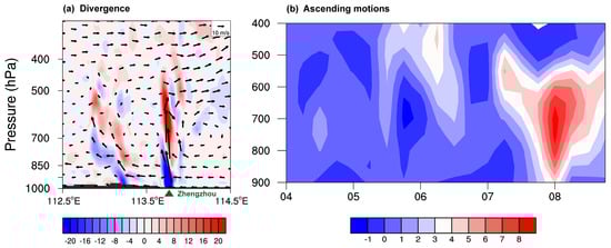 (a) Longitude–pressure cross sections of divergence (shading; units: 10−4 s−1) and zonal circulation (vectors: zonal wind, units: m s−1; vertical wind, units: 10−1 m s−1) along 34.76°N at 0830 UTC on 20 July 2021. (b) The ascending motions (shading; m s−1) at the Zhengzhou station.