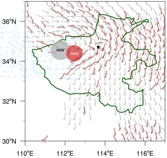 Wind above 6 m s−1 (a full bar is 4 m s−1) at 700 hPa in ERA5 reanalysis data (grey wind barb) and simulation (red wind barb). The grey and red circles represent the location of the HHV in ERA5 and the simulation, respectively. The black star represents the location of the Zhengzhou station.