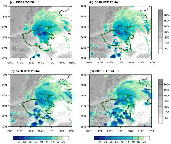 Mai et al. (2020) [] defined an MCS as (1) the scale of cloud areas with the temperature of the blackbody (TBB) ≤ −52 °C exceeding 5000 km2 in the horizontal direction, and (2) cloud areas satisfying (1) that last at least 3 h. Referring to previous work, this study used the TBB of the FY-4A AGRI to analyze the evolution of MCSs (Figure 13). Byers and Braham (1949) put forward the concept of a convective cloud merger, and some subsequent studies have pointed out that a convective cloud merger could not only increase the size and intensity of convective clouds, but also improve rainfall efficiency and cause heavy rainfall on the ground [,,,]. From the TBB (Figure 13), several small cloud clusters were continuously generated in Hubei and Anhui in the southerly airflow and were guided by the southwesterly flow to the northeast; they then merged into the meso-α-scale MCSs stagnated in the north of Henan after 0500 UTC on 20 July due to the blockage of the Taihang Mountain []. However, due to the narrower range of southerly airflow in the south of Henan in this simulation, the windspeed and the variation in the wind with the height were smaller, which was not conducive to the triggering of convection in the south, as is also clear from the simulated radar reflectivity in Figure 4d. This may be the main reason for the weak extreme hourly rainfall at the Zhengzhou station in the numerical simulation. This is a direction that can be focused on in future model improvements.