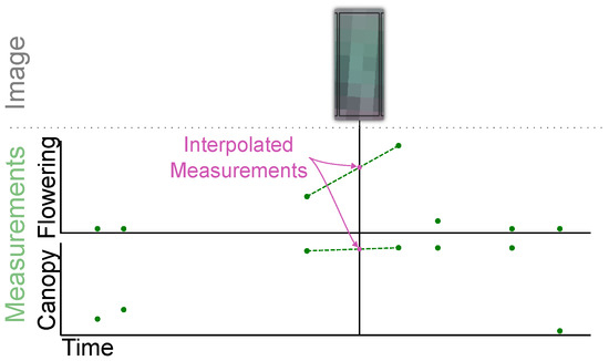 The measurements for each image of each plot were interpolated between measurement dates (green dots) to the date of each image (pink dots) to produce the ground truth values used during training.
