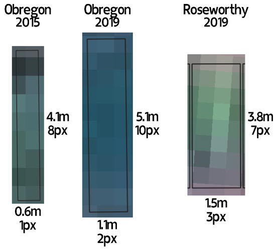 In related UAV research, it is common to discard mixed pixels at the edges of the plot boundary [5,58]. However, when using satellite imagery for per-plot predictions, there are very few pixels to work with, so each pixel is valuable, and discarding pixels on the border of the plot boundaries needs to be carefully considered. For smaller plot boundaries, and for coarser resolution images, this is a greater problem. Eventually, if the plot boundaries are too small compared to the resolution of the image, it becomes impossible to reliably select the pixels that primarily contain the plants in question (see Figure 4). We call this the limit of resolvability, and in this work we showed results all the way up to this limit. In this work, we were forced to use some mixed pixels, otherwise many more plots would have had no pixel data. However, even this substantial challenge did not prevent us from making a model that could predict phenotypic traits.