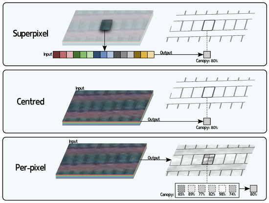 We describe three different methods used to perform these predictions: superpixel, centred, and per-pixel (see Figure 5). The superpixel method (also known as object-based or OBIA) is an existing method [51,52], which we present as a baseline. This method uses aggregated statistics of the pixels contained within the plot boundaries and lacks any contextual information. There are a number of reasons why the aggregated statistics of only the pixels within the plot boundaries may not provide enough information to make accurate predictions. For example, the whole image might have a slight blue tinge due to atmospheric haze. Without the contextual information that everything appears slightly more blue than usual, the superpixel method cannot detect and automatically adjust its prediction in response. Additionally, the plot boundaries are unlikely to precisely align with the pixels in the crop. Sometimes they will include some of the ground or a neighbouring plot. The superpixel method has no way to distinguish between pixels that are relevant and those that are not. In contrast, a CNN is able to see the intra-plot spatial structure and can learn which pixels are important. So, here, we propose two novel methods for making per plot predictions: centred and per-pixel. These methods use contextual information and thus are empowered to handle the aforementioned problems automatically.