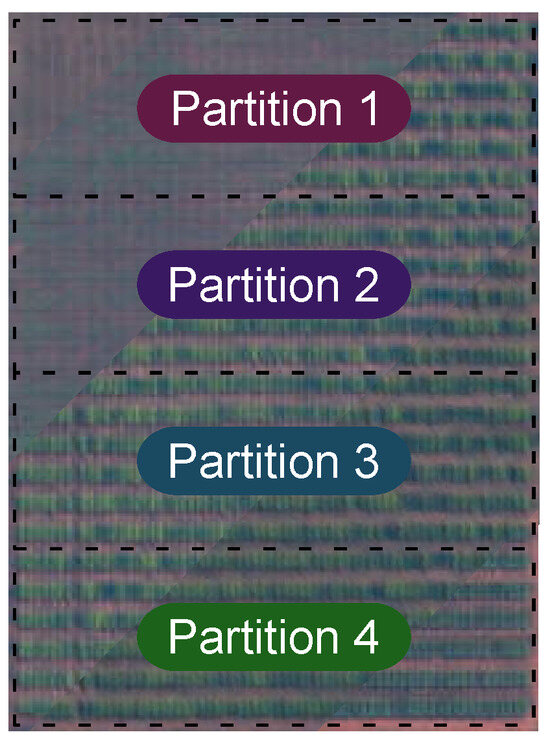 The data for the Roseworthy site were split by row into four partitions, which applied across all images (different images shown as diagonal stripes). Each fold then used a different partition as the test set. Note: the colours in this figure are for illustrative purposes only and do not represent any modification made to the training data.