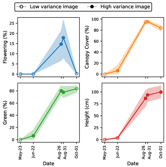 Using only a handful of images limits the models’ ability to generalise, as only a limited range of plant growth is represented. However, it is not as dire as it first appears, as each plot develops at a slightly different rate, and thus their phenotypic traits vary from plot to plot, even within the same image. This is precisely why high-variance images exist. So, although there were only five images, there are thousands of slightly different development stages represented. Unfortunately, the early growth stages were especially poorly represented in our data. For future work, we could represent more varied stages of plant growth within a single image by staggering the planting of the plots or by using breeds with very different flowering times.