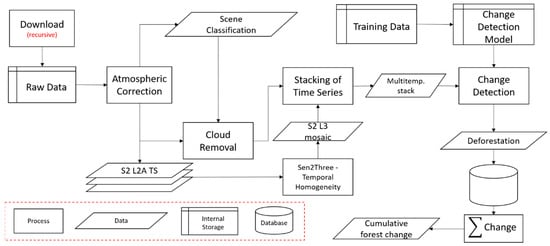 The change detection algorithm in Figure 2 recursively downloads the latest Sentinel-2 image and feeds it into the Sen2COR version 2.5.0 atmospheric correction algorithm. The Sen2COR algorithm provides a scene classification that is reclassified to create a cloud mask, which in turn is used to remove clouds, cloud shadows, and erroneous pixels from the atmospherically corrected Sentinel-2 L2A BOA image. The image is processed at a spatial resolution of 20 m and includes nine spectral bands representing surface reflectance. The new incoming and pre-processed image is then stacked to a multitemporal image using a least-cloudy mosaic created from a time series of images from 2016 to 2017. The least-cloudy mosaic was created using the Sen2Three plug-in to the SNAP software in ‘temporal homogeneity’ mode []. Sen2Three is a level 3 processor for the Spatiotemporal Synthesis of bottom of atmosphere corrected Sentinel-2 level 2a images.