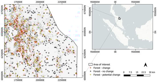 A validation dataset was created using a stratified random sampling strategy and visual interpretation of Planet Dove data (www.planet.com, accessed on 1 November 2023). For each class, i.e., ‘change’ and ‘no change’, 300 points were sampled, and a new class was created, also with 300 points, following the methodology by Olofsson et al. [] (Figure 3). The new class was a 20 m spatial zone encompassing areas of ‘potential forest change’ around the ‘change’ class and was created to reduce omission errors resulting from the visual validation of forest changes. Planet imagery that fit a similar date range of change detection was selected for validation. The image used to evaluate change detection accuracy was acquired on 16 February 2018.