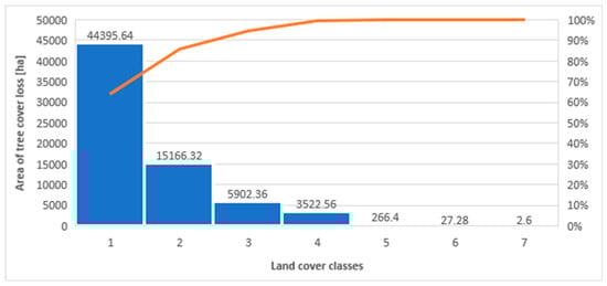 Bar plot (blue) and cumulative line plot (orange) showing the area distribution of detected tree cover loss cover per GLC2000 land-cover class in the study area. The x-axis shows the land-cover classes, which are: (1) mosaic (crops, tree, natural vegetation), (2) cultivated and managed areas, (3) tree cover, (4) mosaic (tree cover, natural vegetation), (5) sparse and herbaceous and shrubs, (6) artificial surfaces, (7) water.