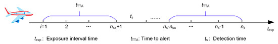 where HMI represents the hazardous misleading information, which is the situation when an undetected positioning error exceeds a predefined alert limit (AL). There are three different time metrics for integrity risk evaluation, i.e., the exposure interval time (texp), the time-to-alert (tTTA) defined by required navigation performance, and the single detection time (ts). Based on these time metrics, two parameters required for integrity risk evaluation, i.e., ns and nsa, can be determined. The ns is the number of epochs in the texp, i.e., texp/ts. The nsa is the number of epochs in the tTTA, i.e., tTTA/ts. As seen from Figure 1, we usually have texp > tTTA > ts. Furthermore, Hk in (1) represents the fault mode hypotheses for k = 0…N, which account for all fault satellite combinations including H0, single satellite fault, multi-satellite faults, and constellation fault [22,23,24,25]. N is the number of fault modes to be monitored. PNM(texp) is the probability of the fault modes that need not be monitored in the exposure interval. The calculation method of PNM(texp) and the fault modes number N can be found in [16]. i and j represent the epoch time within the exposure interval. It should be noted that we will denote the event of continuous HMI occurrence within tTTA under fault mode k, i.e., , as in the following to simplify the notation.