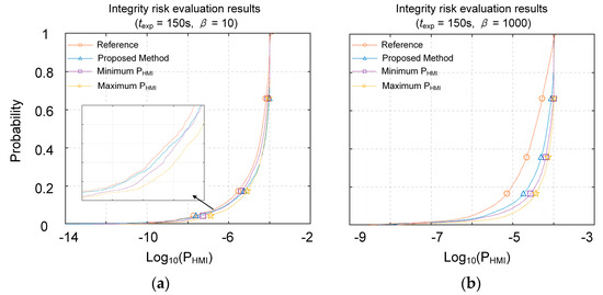 Integrity risk evaluation results of different methods under LPV-200 situation. The subfigure (a,b) indicates that β is 10 and 1000, respectively.