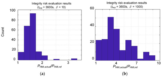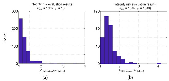 Figure 3 and Figure 4 illustrate the evaluation tightness of the proposed method. β = 10 and β = 1000 were utilized to represent the cases with weak and strong time correlations of positioning errors, respectively. In cases of the low error correlation, as indicated in Figure 3, the empirical cumulative distribution functions (ECDFs) based on the actual integrity risk and reference were very close. This means that the proposed method effectively reflects the integrity risk reference. However, in cases of strong error correlation, the difference between the actual integrity risk results and reference increased. This is attributed to our assumption that is independent of time during the integrity risk evaluation, which leads to conservative evaluation results as the positioning error correlation increases. The more conservative the actual integrity risk, the higher the likelihood of a false decision occurring in the subsequent performance analysis is. The false decision implies that the integrity risk reference is below PHMI,REQ, but according to the proposed method, we conclude that ARAIM is not available. In order to analyze whether the evaluation results are too conservative, we further analyzed the bounding tightness of the actual integrity risk to the reference. We chose the ratio between the actual integrity risk and the reference as the tightness index. It should be noted that we only considered the reference results below 10−7/approach for analysis, as results greater than this threshold would not lead to a false decision. As shown in Figure 4, the tightness index of the proposed method is mostly less than 2. This implies that a false decision occurs only when the reference integrity risk is extremely close to the predefined PHMI,REQ, for instance, falling within the range of 5 × 10−8/approach to 1 × 10−7/approach. Furthermore, according to the analysis by [20], due to the high sensitivity of integrity risk to geometry variation, it usually either falls significantly below the PHMI,REQ or notably exceeds the requirement, and rarely falls near the PHMI,REQ. The bounding tightness analysis implies that the proposed method has the ability to verify the ARAIM integrity performance in an LPV-200 approach.