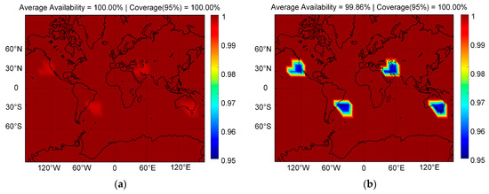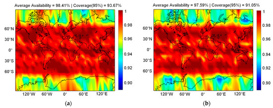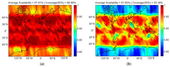 Availability map of the ARAIM with one-satellite outages. The subfigure (a,b) represents the availability of ARAIM based on the traditional method and the proposed method, respectively.