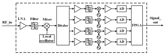 FY-4 microwave satellite platform and microwave payload are manufactured by Shanghai Institute of Satellite Engineering and Shanghai Spaceflight Institute of TT&C and Telecommunication, respectively. FY-4 microwave hyper-spectral band is achieved through intermediate frequency sampling and digital detector integration techniques. The microwave radiation emitted by the earth-atmosphere system is received by the 5-m antenna and horn feed, and then is mixed with local oscillator to the range of 1.7 GHz to 6.3 GHz. After power division, secondary mixing and filtering, the intermediate frequency signal with a bandwidth of 1.2 GHz is outputed. It is then sampled by the high-speed Anolog to Digital. Digital detection and accumulation are completed by the Field Programmable Gate Array (FPGA) after sampling. Finally, a total number of 89 channels are outputed at the vertical polarization via FPGA processing. Channels 1–12 cover 52.6 GHz to 55 GHz band with the resolution of 200 MHz, and channels 13–89 cover 55 GHz to 57.3 GHz band with the resolution 30 MHz, respectively. In order to better satisfy the requirement of the spectrum sampling, the channels are designed to have the capability of adjusting their widths to some extent on orbit under the condition that the total band range is unchanged. The entire signal processing flow is described in Figure 1.