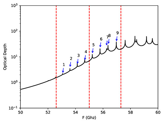 The microwave hyper-spectral range and the optical depth as a function of frequency near 55 GHz. The left and the right dashed lines show the band boundaries. The middle dashed line shows the boundary between the two sub-bands. Nine fine oxygen absorption lines are indicated by the numbers.