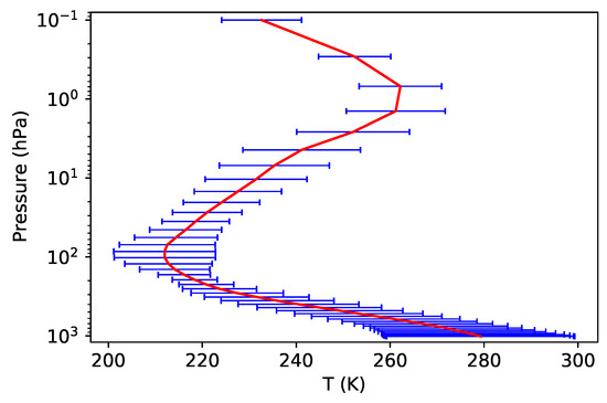 Two atmospheric profile datasets has been used in the simulation. The first data set is a climate data set and has 42 profiles. Each profile is divided into 43 levels (L43) with the top at about 0.1 hPa. As a supplement, another data set generated at the European Center for Medium-Range Weather Forecasts (ECMWF) [14], containing 83 profiles and 101 levels (L101) with the top at about 0.005 hPa, was also adopted. For the first data set, Figure 3 shows the distribution of the means and the standard deviations of the temperature profiles. The maximum change in temperature occurs at the bottom where the mean temperature is near 280 K with the standard deviation of 20 K. The temperature profiles in the second dataset have similar statistical characteristics with the mean of 274 K and the standard deviation of 24 K at the bottom. The two datasets contain concentrations of gases including ozone, water vapor, carbon dioxide, etc. The concentrations of oxygen and nitrogen dioxide are set to be constants in the simulations. The viewing angle is set to zenith and the surface emissivity is assumed to a constant value of 0.6.