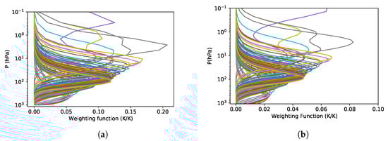 The temperature weighting functions calculated using an individual profile for the microwave hyper-spectral band. Each curve corresponds to a channel. (a) the first L43 data set. (b) the second L101 data set.