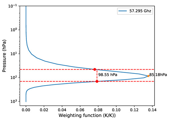 The ideal weighting function should be like a very thin impulse response function. However, the actual weighting function has certain width. Although the weighting functions of microwave are much broader than those of infrared sounders, the ability of sounding in all weather conditions makes them one of the most useful measurements for NWP models [15]. Generally, for a channel detecting a certain level of atmosphere, especially in the middle and upper atmosphere, the higher the spectral resolution is, the narrower the weight function is, thus resulting in better vertical resolution. In order to quantify this relationship, as mentioned in Section 3, we use the FWHM to assess the sampling vertical range of the atmosphere. To illustrate this, Figure 6 shows a typical weighting function as a function of pressure. The peak of this weighting function locates at about 85 hPa, and its FWHM is about 98 hPa. FWHM can also be used to measure two adjacent weighting functions. If the distance of the two peaks is greater than one FWHM, it can be said that the two weighting functions are well distinguished.