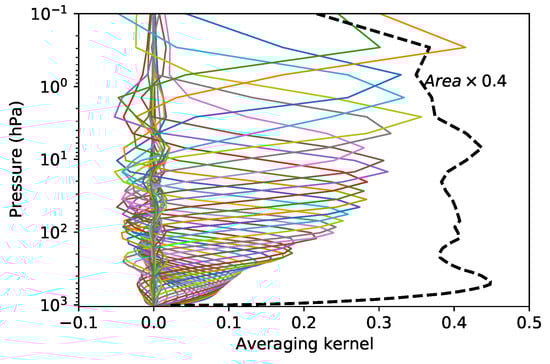 The averaging kernel takes into account the impacts of the instrument observation noise and weighting function. They are more useful in practical inversion. Here, we use the measurement noise listed in Table 1 to calculated the averaging kernel matrix and its area. Figure 8 shows the averaging kernels for a subset of levels in the first data set. When the state vector represents a temperate profile in the retrieval, the kernel matrix can be regarded as smoothing functions. Due to the influence of noise, the kernels have negative values and become peaked functions with a certain width which is a measure of the spatial resolution of the instrument, providing the relationship between the retrieval and the true statement. Compared with Figure 4, it can be seen that the width of the averaging kernels are narrower than those of the original weighting functions. Therefore, these channels have better resolution ability for the actual vertical profile of the atmosphere. Also shown as the dashed line is the area region of the averaging kernels, scaled by a factor of 0.4. Except for the top and bottom regions, the area value is close to 1 from 800 hPa to 0.3 hPa, indicating that the inversion is very sensitive to the true atmospheric profile in these height regions. Thus, the channel noise of 1 K is acceptable not only in actual inversion for the data user but also in instrument manufacturing for the industry sector.