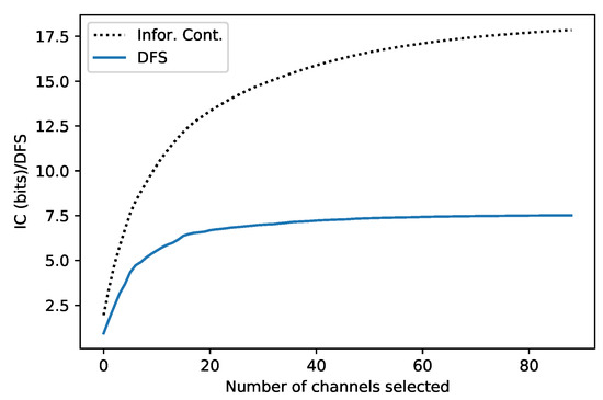 Channel selection can be performed by comparing information content among different channels [5,18,19]. Table 3 shows the top 10 channels with the high information content. There is a good correspondence between the information content and DFS for each channel. Figure 12 shows the cumulative information content and DFS against the number of channels counted. Both of them show the similar variation trend with the number of channels, i.e., increase rapidly at the beginning, and slowly later. The sum of information content and DFS for the top 10 channels is about 55% and 71% of the total information for the 89 channels, respectively. When the top 20 channels are counted, the percentages further increase to 74% and 88%, respectively. It indicates that the total information content of the microwave hyper-spectral band is greatly increased, compared with several channels employed by existing sensor in the same band range.