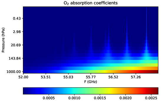 Weighting function is a very important parameter for analyzing the performance of hyper-spectral band because it can specify which part of the atmosphere the radiation comes from. It can be characterized by its peak altitude and FWHM, which can be used to measure whether two adjacent functions can be clearly distinguished. Most of the weighting functions have smooth shape from the bottom to the upper atmosphere, looking like a spectral response function. Only a few channels have irregular shape mainly because the continuous sampling of the spectrum can not exclude the center of the fine absorption line. These channels are not suggested to be used in the retrieval of atmospheric temperature. But they can be used in the NWP model where the retrieval of temperature is not needed. Furthermore, the distribution of the absorption coefficients is the main physical basis for analyzing the characteristics of the weighting functions. Figure 14 shows the layered oxygen absorption coefficients near 55 GHz. At the bottom atmosphere, the absorption is nearly continuous. But at the upper atmosphere, it is isolated and exhibits great gradient around each line. As mentioned above, if the peak of the small oxygen absorption is located asymmetrically in a channel’s pass band, the weighting function will appear irregular.