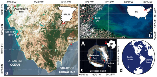 Figure 1. Tested Study Locations. (a) Location of the areas where UAV surveys were conducted in Southern Spain. (b) Location of the Lake Erie area where the UAV survey took place. (c) Location of the two bays where aerial thermography was carried out using UAVs on Deception Island (South Shetland Islands, Antarctica). (d) Global location of (a) Spain, (b) the United States (U.S.), and (c) Antarctica (ATA). - −