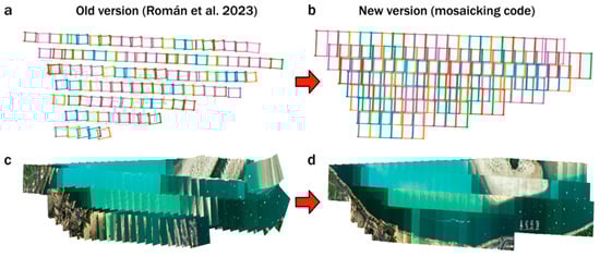 Improvement of the method with respect to the reference [13]. Panels (a,b) systematically represent how the new version of the code corrects the georeferencing errors from the previous version, considering the sensor size and flight angle orientation correctly. Panels (c,d) visually demonstrate how, with the new version of the code, the visual elements of the area of interest that have been mosaicked can be correctly identified.