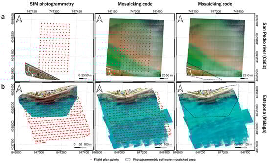 Application of the mosaicking technique to optical RGB datasets. Comparison between the georeferenced orthomosaic generated after an SfM photogrammetry process and the georeferenced orthomosaic generated after applying the Python-based mosaicking code in (a) the San Pedro River creek case study and (b) the Estepona case study. Red dots indicate each flight plan points, and the black dashed lines frame the mosaicked area using the SfM photogrammetry process.