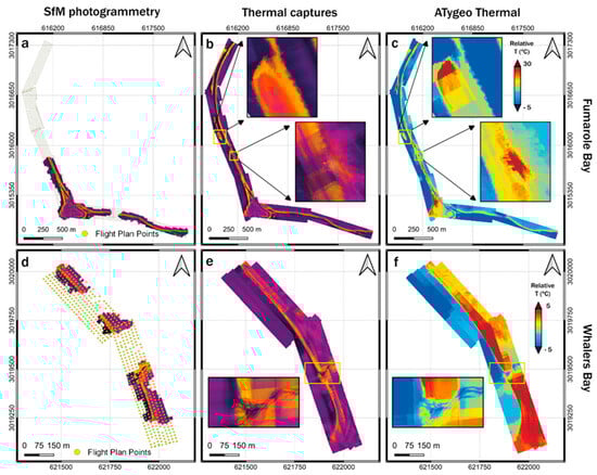 Application of the mosaicking technique to thermal datasets. Comparison between the performance of (a,d) SfM photogrammetry, (b,e) the mosaicking code on the original thermal captures taken by the M2EA, and (c,f) the thermal captures corrected with ATygeo Thermal software, using two datasets captured on Deception Island (Antarctica). Both datasets exhibit temperature oversaturation, particularly above the maximum values displayed on the color bar. Yellow dots indicate each flight plan points. Specific areas showing the presence of thermal anomalies in Fumarole Bay and a coastal stream in Whalers Bay have been outlined.