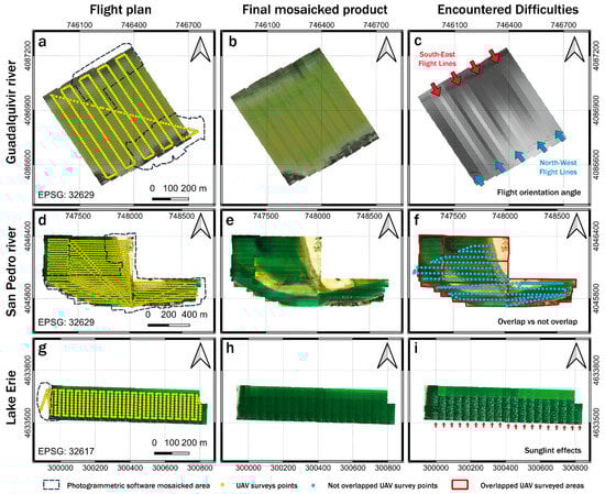 Encountered difficulties in mosaicking multispectral imagery. Guadalquivir River case study: (a) flight plan (yellow dots) and the area covered by photogrammetry (delimited by black lines); (b) final mosaicked product without flight trajectory angle correction; and (c) issue with flight orientation angle. San Pedro River case study: (d) flight plan (yellow dots) and the area covered by photogrammetry (delimited by black lines); (e) final mosaicked product considering 80% frontal and side overlapping; and (f) comparison of the covered area with and without considering overlap. Blue dots indicate the covered area when not considering overlap in the flight plan, while red rectangles represent the covered area when considering overlap in each flight plan. Lake Erie case study: (g) flight plan (yellow dots) and area covered by photogrammetry (delimited by black lines); (h) final mosaicked product after applying sun glint correction; and (i) issue of sun glint effects on the final mosaicked product.