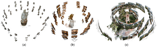 Image acquisition pattern displayed for the neural renderings of the following: (a) the Terpsichore, (b) the eagle-shaped lectern, and (c) Caprona Tower.