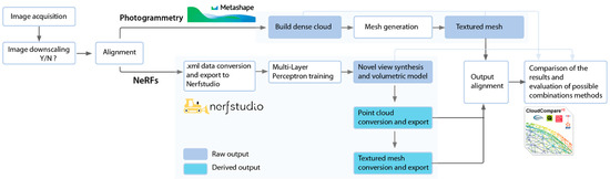 As the alignment procedure is common to both processes and is executed following photogrammetry principles, an initial assumption is made about the dataset: the images used for reconstructing the 3D scene can be aligned, which is to say that the estimation of camera poses is feasible using the input images. In both cases, camera orientation parameters are calculated using Agisoft Metashape 2.1.0 software. The camera data file in .xml format, exported from Metashape, is then imported into Nerfstudio [43], serving as the initial data for the 3D scene reconstruction. It is important to note that for this step to work, all images are required to be of the same sensor type. By way of comparison, since the output of photogrammetry cannot be directly confronted with neural rendering, an additional conversion phase is introduced.