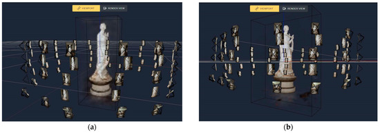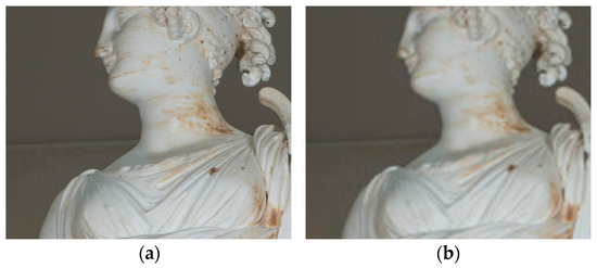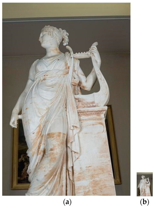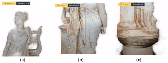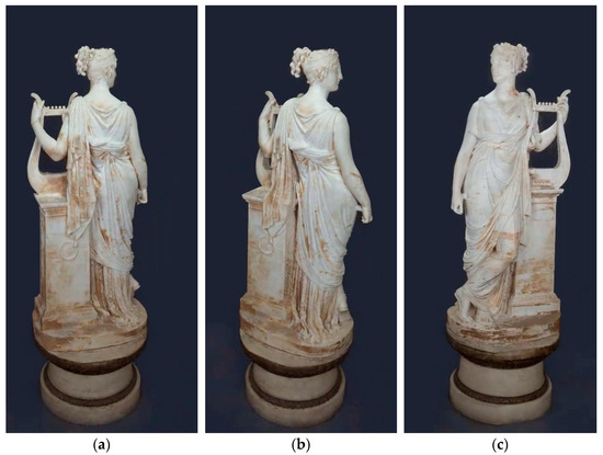 The pilot case study chosen to test the approach is the statue of Terpsichore, the masterpiece of the Italian artist and sculptural exponent of Neoclassicism, Antonio Canova (Figure 2a). The statue represents the muse of dance and choral singing, Terpsichore, as can be deduced from the lyre placed on the high pedestal. The work has intricate details, such as the strings and soundbox of the lyre or the drapery of the robe, and has specific material characteristics that are difficult to reproduce, such as the homogeneity of the color and the white and pink veining of its material. The survey was carried out by ACAS3D Digital Solutions, a spinoff of the University of Pisa, using a Nikon D850 camera equipped with a 50 mm fixed focal length lens and operating in aperture priority mode (f/13). The original dataset consists of 233 images, each with a resolution of 2752 × 4128 pixels.