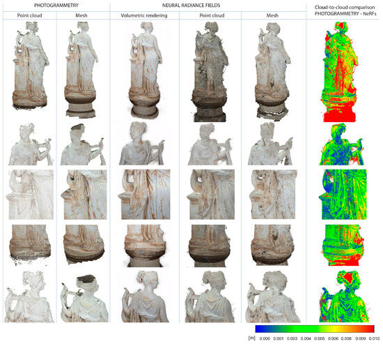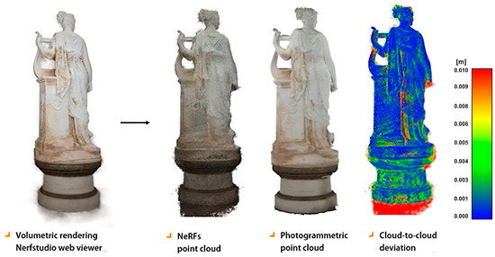 For the last case (Figure 14), higher deviations, reaching a value of 1 cm, are observed at the head of the statue as well as in the lower part of the pedestal; indeed, these parts appear to be entirely missing in the photogrammetric results. Meanwhile, average deviations of 4 to 5 mm are found along the entire drapery. The consideration of the observed noise in the NeRF point cloud, as anticipated for the first case, is relevant for all the other cases mentioned above. This can also be appreciated by a visual comparison between the volumetric rendering and the photogrammetric mesh.