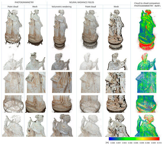 The complete synoptic tables for all four datasets are presented in Figure 11, Figure 12, Figure 13 and Figure 14, respectively. First, each synoptic table illustrates a general overview of the whole result of the point cloud and mesh from photogrammetry; the neural rendering, extracted point cloud, and extracted mesh from NeRFs; and the cloud-to-cloud comparison between NeRFs and photogrammetry. In addition, detailed, zoomed-in views of specific areas where the differences among the various tests are most pronounced are presented for each result. These areas of focus include the head, pedestal, base, and rear of the statue, with specific attention to details of the lira.