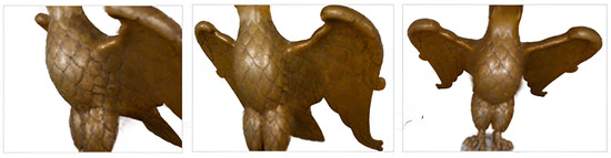 The second case study considered is that of the eagle-shaped lectern (254 images) that presents specular reflections and other variations in appearance based on the direction of incoming light and the viewing angle due to the metallic, shiny surface of the bronze (Figure 2b). The survey was carried out by ACAS3D Digital Solutions, a spinoff of the University of Pisa, using a Nikon D850 camera equipped with a 50 mm fixed focal length lens and operating in aperture priority mode (f/13).