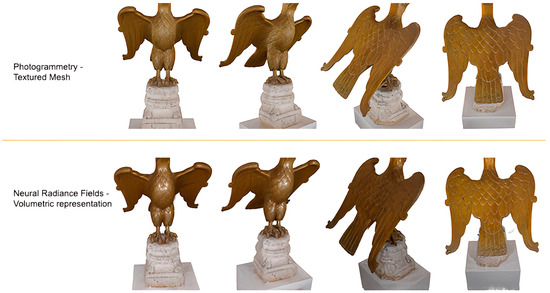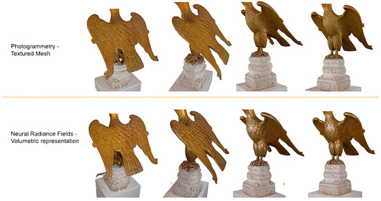 - Compared to photogrammetry, NeRFs may offer the ability to handle reduced image data or reduced resolution of the images, with lower quantitative information loss. For the 3rd and 4th cases analyzed, indeed, NeRFs capture details, such as the head and lower pedestal, which are absent in the photogrammetric output. This is true, however, if the reconstruction of camera poses is possible over the reduced datasets;