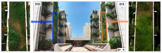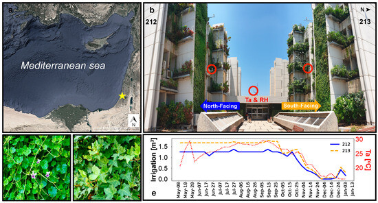 The study was conducted on real-scale VGS as part of the BIU-VGS project at Bar Ilan University (32.067, 34.842) in Mediterranean climate Ramat Gan, the central region of Israel (Figure 1). The study site comprised three identical buildings in the southern campus, which replicated two east–west oriented street canyons. Each building consisted of five floors, with an overall height of 20 m. The canyons had concrete walls facing north and south. During the period from 3 to 18 November 2019, planters were installed on two parallel vertical walls in one of the canyons, covering approximately 450 m2 of vegetated area for each wall. Two VGS technologies were utilized—a green/living wall (GW) on the eastern shafts and a vertical forest (planter boxes attached to the wall) on the remaining walls and the western shafts. The GW was constructed using plastic modules containing a blended soil substrate for planting (40% peat, 40% coconut, and 20% perlite). The case study focused on the GWs located on two vertical concrete walls—one facing north (building 212) and the other facing south (building 213), as shown in Figure 1b. Each GW had dimensions of 11 m in height and 2.7 m in width, covered with plant species Viola hederacea (Figure 1c) and Hedera helix (Figure 1d).