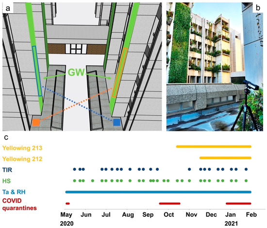 Data acquisition at the study site. (a) Locations (rectangles) of the HS and TIR shooting of the north (blue) and south (orange) facing GWs. (b) The thermal camera on a tripod toward the north-facing GW at the study site. (c) The timing of the data acquisition in this study, including the yellowing events that were studied for early detection of stress (see Section 2.4) and COVID quarantines that affected mainly the collection of TIR data.
