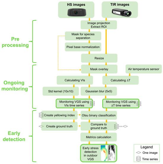 Adopting remote sensing and precision agriculture methods for VGS can greatly improve ongoing plant monitoring and aid in the early detection of plant stress. Early detection of changes in plant health is critical for successful agricultural growth [21]. Hyperspectral (HS) and thermal (TIR) imaging are well-established methods in agriculture and natural areas [22,23,24]. The interaction of objects with light at different wavelengths determines their spectral characteristics. For instance, plant pigments exhibit distinct features, such as chlorophyll absorption bands in the blue and red regions. Healthy plants generally have lower reflectance in the visible bands and higher reflectance in the near-infrared (NIR) bands than plants under stress. HS imaging can identify subtle differences in vegetation that may not be visible to the human eye. This technique has been successfully applied to various crops, including estimating biochemical and biophysical properties; evaluating nutrient and stress status; classifying or detecting crop types, weeds, and diseases; and investigating soil characteristics [25,26]. Nevertheless, HS cameras are expensive, and analyzing tens to hundreds of bands in the visible and near-infrared regions can be computationally intensive and time-consuming. Therefore, vegetation indices (VIs) are commonly used to quantitatively and qualitatively highlight specific vegetation features, such as chlorophyll and water content, based on a combination of reflectance at two or more wavelengths in the electromagnetic spectrum [27]. TIR imaging is often employed to assess temperature differences indicating stress derived from diseases [28] or water deficits in crops [29]. Furthermore, TIR imaging allows targeted interventions and optimization of irrigation strategies [30,31,32].
