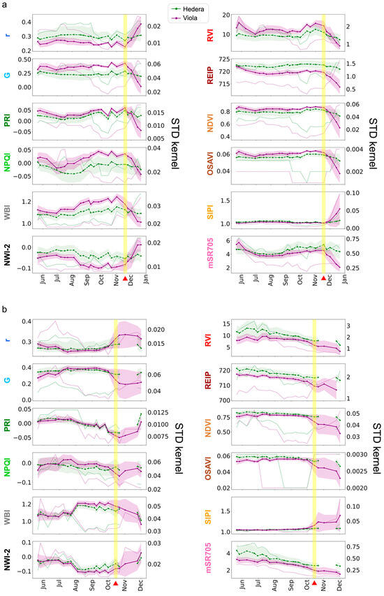 For the north-facing GW (Figure 7a), the average NDVI and standard deviation were 0.84 and 0.017 (Viola hederacea), and 0.79 and 0.019 (Hedera helix), respectively, from the beginning of the monitoring until the yellowing event. Just before the yellowing event (14 October to 1 November), the averages increased even further, and the standard deviation decreased (0.87, 0.009 for Viola hederacea; 0.83, 0.012 for Hedera helix). At the onset of the yellowing event (18 to 24 November), the averages decreased to 0.84 (−3.4% for Viola hederacea) and 0.81 (−2.4% for Hedera helix), and the standard deviation increased to 0.049 (540% for Viola hederacea) and 0.044 (360% for Hedera helix) compared to the period just before the yellowing event. As the yellowing event progressed (1 to 21 December), the averages further decreased to 0.651 (−22% for Viola hederacea) and 0.759 (−6% for Hedera helix), and the standard deviation increased to 0.154 (314% for Viola hederacea) and 0.077 (175% for Hedera helix), compared to the beginning of the yellowing event. Similarly, the REIP and OSAVI averages decreased, and the standard deviation increased at the beginning of the yellowing event and beyond. The water content indices, WBI and NW-2, exhibited periodic changes throughout the study, with more drastic average decreases and standard deviation increases (WBI: −5.7%, 270%; NW-2: −15.7%, 300%) in Viola hederacea at the beginning of the yellowing. Other VIs were either not stable (e.g., r, G, PRI, NPQI, RVI, and mSR705) or very stable (e.g., SIPI) throughout the seasons, but also showed a decrease in average value and a drastic increase in standard deviation at the beginning of the yellowing event. Both species experienced decreases in average VIs and increases in standard deviation, indicating degradation of the entire GW during the yellowing event. Nevertheless, the changes in average and standard deviation values were more significant for Viola hederacea, and it eventually turned yellow and died. As for the STD kernel, the increase for both species began even before the beginning of the yellowing event (around 21 October) and continued to rise until the end of the time series. Some indices (e.g., NDVI, G, and PRI) exhibited a more synchronized response with the vegetation condition than others (e.g., NPQI, NWI-2, and mSR705).