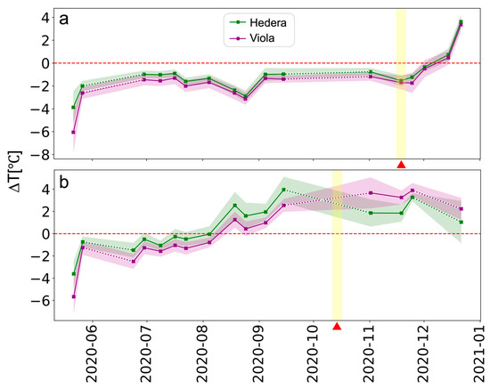 Time series of Viola hederacea (purple), and Hedera helix (green) average ∆T index in the (a) north-facing (212) and (b) south-facing (213) GWs. The vertical yellow shading and red triangle indicate the beginning of the yellowing events in each GW. The dotted lines are an interpolation of the missing data.